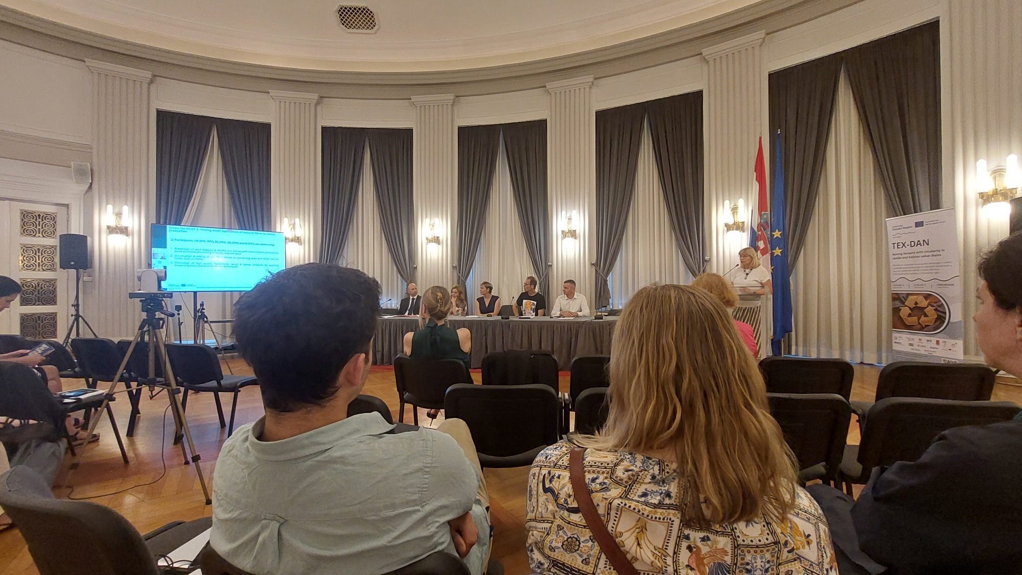 A mid-term dissemination event of the Interreg DRP PA8 flagship project TEX-DAN, hosted by the project partner HAMAG-BICRO, was held in Zagreb on 12 June 2025, in a hybrid form. It gathered in total over 65 participants from 11 countries of the Danube Region, including all project partners, representatives of the sister project GREEN-TEX, regional SMEs involved in pilot projects experts for sustainable textile and clothing, and academic researchers. The PA8 Coordinator from the Croatian Ministry of Economy provided an overview of PA8 current and planned activities, interlinkage with PA8 Working groups, especially with activities of the WG Circular and Bioeconomy. The common goals are circularity in textile and fashion value chains, circular production processes, zero waste concept, projects synergy (between TEX-DAN and GREEN-TEX) to enhance competitiveness of regional SMEs and spread circular practice, research findings, data exchange in the DR, with social and environmental impact.