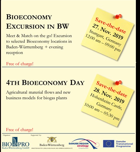 Two events under the motto “Transnational Bioeconomy Partnerships: Meet & Match on the go!” will take place in Stuttgart, Germany, on the 27-28th of November 2019 and are organized in cooperation with the Ministry of Rural Affairs and Consumer Protection and the Ministry of Economic Affairs, Labour and Housing of Baden-Württemberg, which is responsible for the coordination of the Priority Area 8 of the EUSDR.