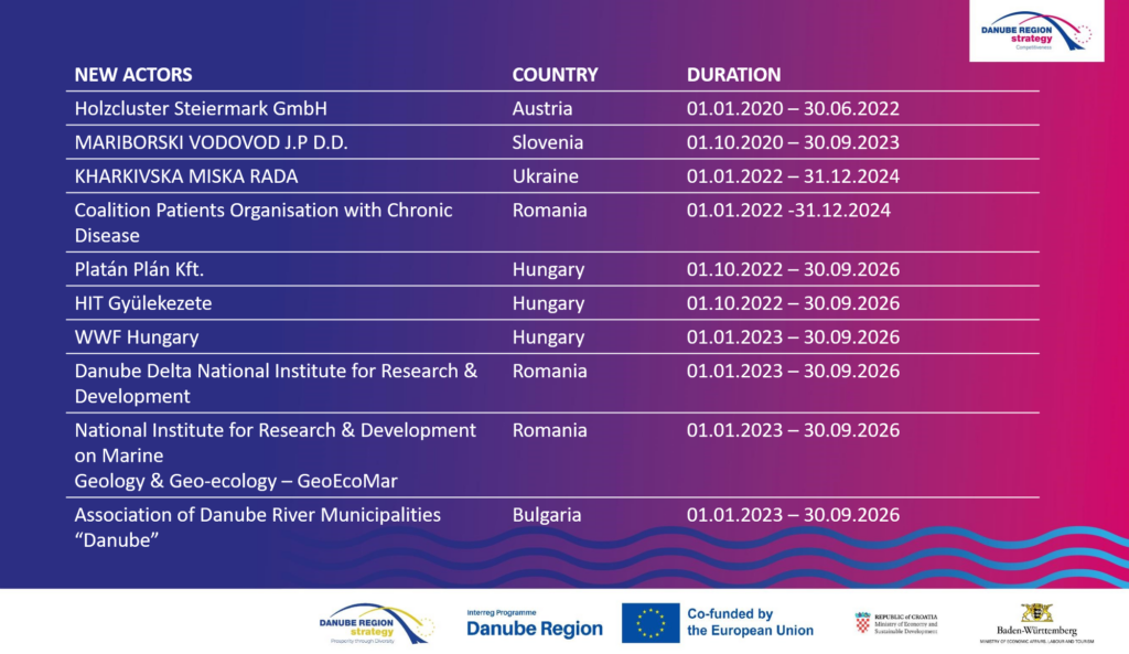 The achievement of the respective targets is monitored continuously. In fact, both targets set by the WG I&TT for 2022 haven been achieved with great success. For target 1.1, a total of 23 offers and requests were implemented between the Danube Partners. For target 1.2, exactly 10 new Danube partners were successfully invited to participate in EU-funded projects in the period 2020-2022. The following table shows the 10 new project partners: